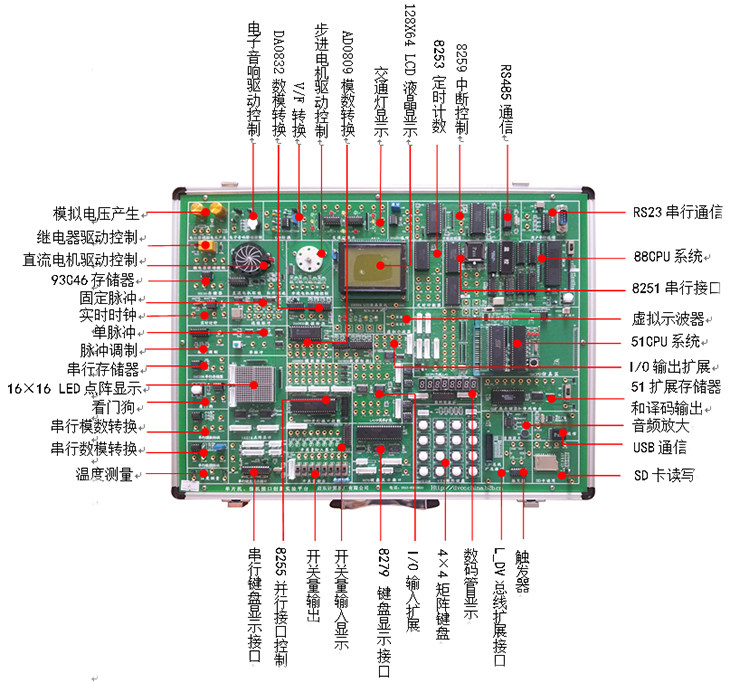 含箱體、電源、51單片機系統(tǒng)和微機接口8088系統(tǒng)以及標配實驗電路 |