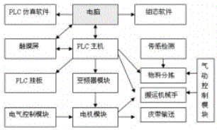 光機(jī)電一體化實(shí)訓(xùn)裝置由型材導(dǎo)軌式實(shí)訓(xùn)臺(tái),典型機(jī)電一體化設(shè)備機(jī)械部件,PLC模塊,變頻器模塊,按鈕模塊,電源模塊,低壓電器模塊,模擬生產(chǎn)設(shè)備實(shí)訓(xùn)模塊(包含上料機(jī)構(gòu),搬運(yùn)機(jī)械手,皮帶輸送線,物件分揀等)接線端子排,各種傳感器,警示燈和氣動(dòng)電磁閥等組成。整體結(jié)構(gòu)采用開放式和拆裝式設(shè)計(jì),學(xué)生可以組裝,接線,編程和調(diào)試由上料機(jī)構(gòu),搬運(yùn)機(jī)械手機(jī)構(gòu),皮帶輸送線和物料分揀組成的光機(jī)電一體化設(shè)備。裝置的總體結(jié)構(gòu)示意圖如圖主所示。