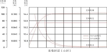 鉛酸蓄電池要求采用限流恒壓的充電方法進(jìn)行充電。在環(huán)境度為25℃的條件下,最佳的浮充電壓為13.6±0.1V X臺數(shù),充電開始時的電流應(yīng)限制在0.25C10A的范圍內(nèi)。
