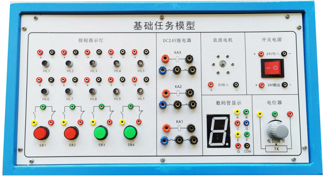該任務(wù)盒有1.2mm優(yōu)質(zhì)鋼板加工噴涂制作,面板有鋁板加工沖孔而成,表面貼膜制作,配置有直流電機、7段數(shù)碼管、彩燈組、繼電器組、按鈕組、電位器等,能滿足對PLC教學基礎(chǔ)任務(wù)指令的學習與應(yīng)用。