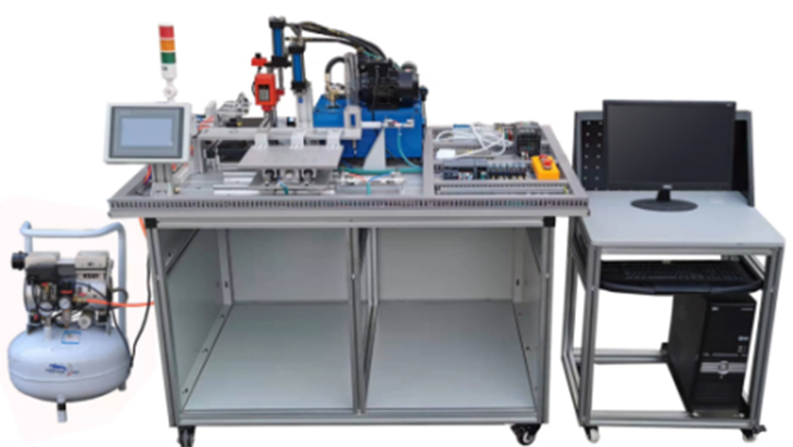機(jī)電液氣一體化綜合實(shí)訓(xùn)考核裝置實(shí)訓(xùn)工作臺架為鋁合金型材結(jié)構(gòu),在上面可安裝上料單元、間歇式傳送及夾緊單元、沖壓單元、鉆孔單元和分揀單元,并配有PLC主機(jī)、變頻器、觸摸屏、傳感器、三相異步交流電機(jī)、交流減速電機(jī)、直流電機(jī)、液壓機(jī)系統(tǒng)、鉆機(jī)及其液壓進(jìn)給系統(tǒng)、氣壓傳動(dòng)系統(tǒng)等,構(gòu)成一個(gè)典型的機(jī)電氣液綜合應(yīng)用系統(tǒng)。可以進(jìn)行典型機(jī)電氣液一體化系統(tǒng)的安裝、液壓氣動(dòng)管路安裝、電氣控制線路布線、觸摸屏與PLC編程及調(diào)試、整機(jī)調(diào)試及運(yùn)行等技能訓(xùn)練,從而使學(xué)生掌握機(jī)電氣液的相關(guān)知識和技能。